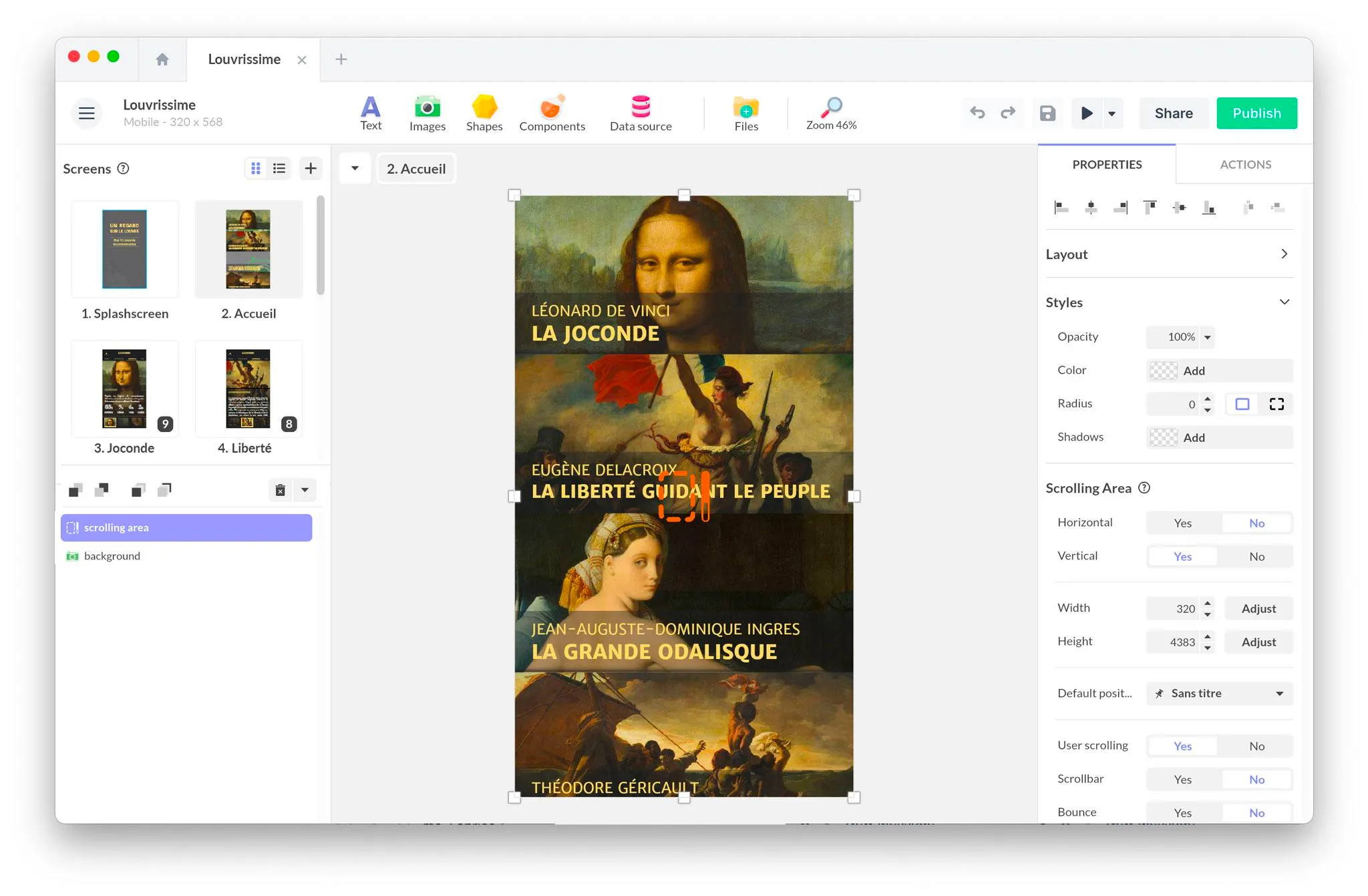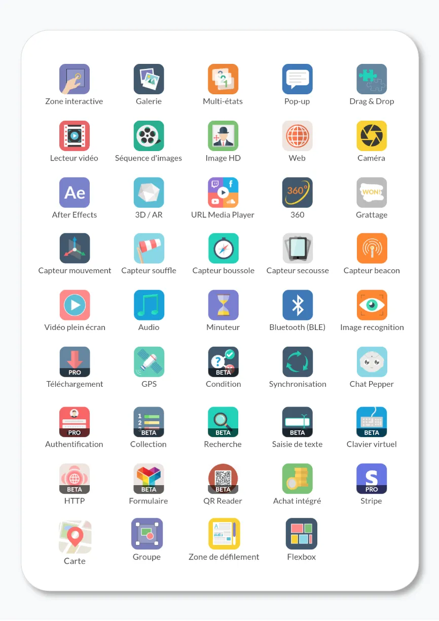 A component is a ready-to-use module that allows you to add interactive effects (scrolling, pop-up,..) and to add functionalities (integrated purchase, authentication…) to your application. There are several types of components: graphics, layout, system and data.