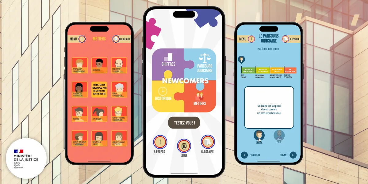 The PJJ (French Judicial Youth Protection) welcomes many newcomers every year. To facilitate their integration and familiarize them with the more technical aspects such as legal procedures and acronyms, the PJJ has developed the Newcomers mobile application. This application serves as a comprehensive guide, providing all the necessary information in an interactive and engaging manner.