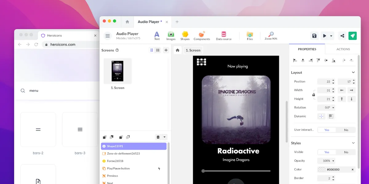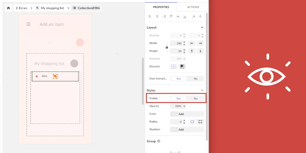 The new Visibility property allows you to display or not an object in your interface. It is of boolean type: Yes or No. Unlike opacity, when an object is not visible, it no longer exists and is not “rendered” on the various platforms. It is therefore a particularly useful property for dynamic display of content, especially in a Flexbox or Collection component, for example when the content is empty, in order to reduce space.
