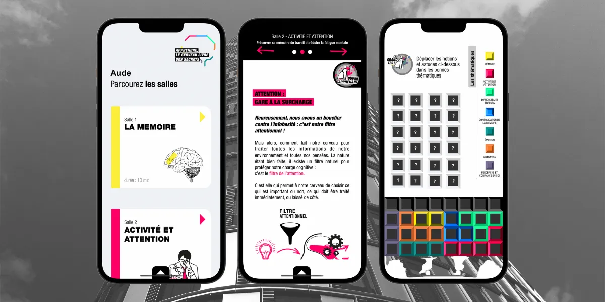 IFCAM is the university of the Crédit Agricole Group. It offers a travelling physical exhibition (panels and multimedia terminals) on its campuses to make employees aware of how their brain works. The Covid crisis forces them to rethink the way they learn. Their challenge was how to offer a digital version of this exhibition to make it accessible to the greatest number and above all engage learners in this format?