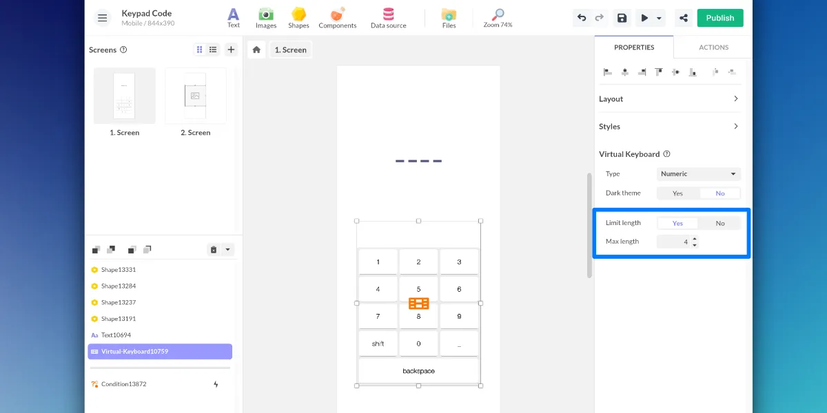 - The Limit length and Max length properties allow you to introduce a limitation on the length of the text entered. For example, a digicode is only 4 digits long.